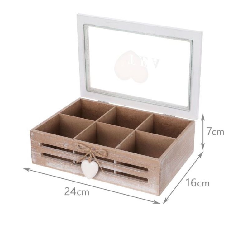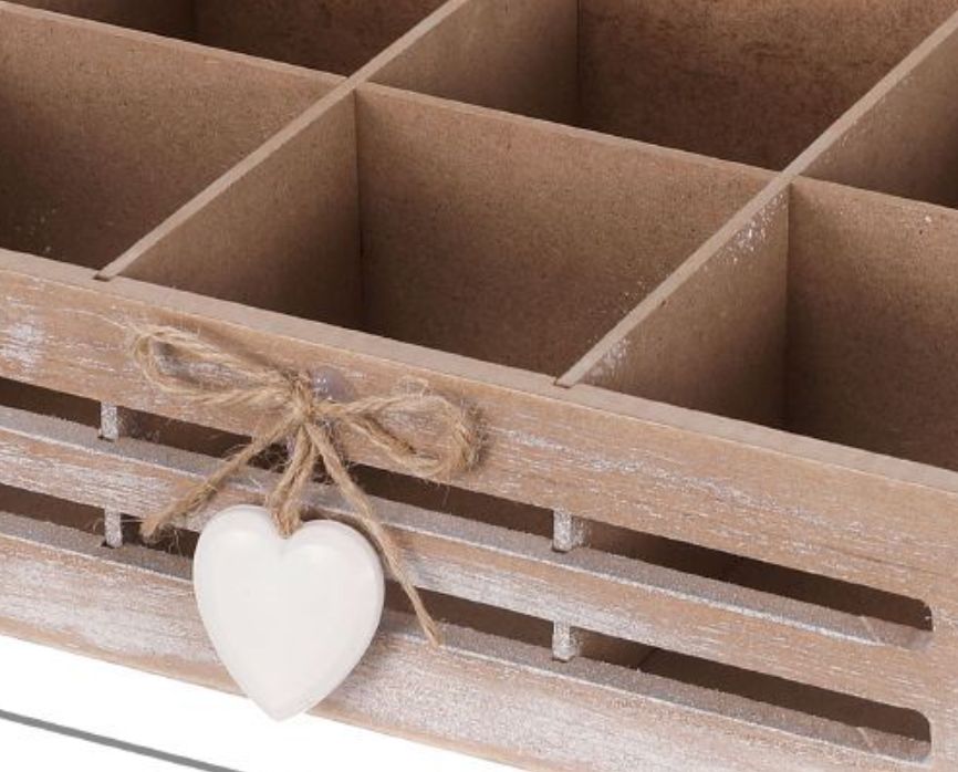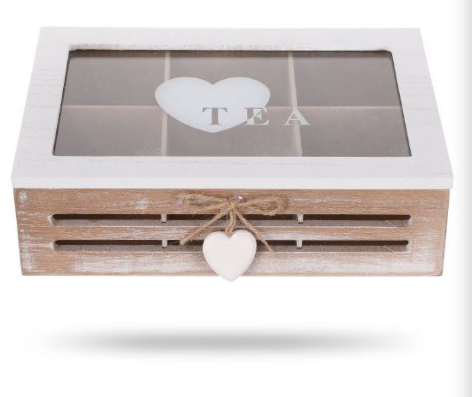 DETALLES DEL PRODUCTO: Caja de té de 6 compartimientos disponibles varios colores. Esta caja de té es ideal para guardar tus variedades de té y mantener un orden! Hecho de madera con tapa de vidrio. Medidas: Alto: 7cm ancho: 24cm largo: 15cm